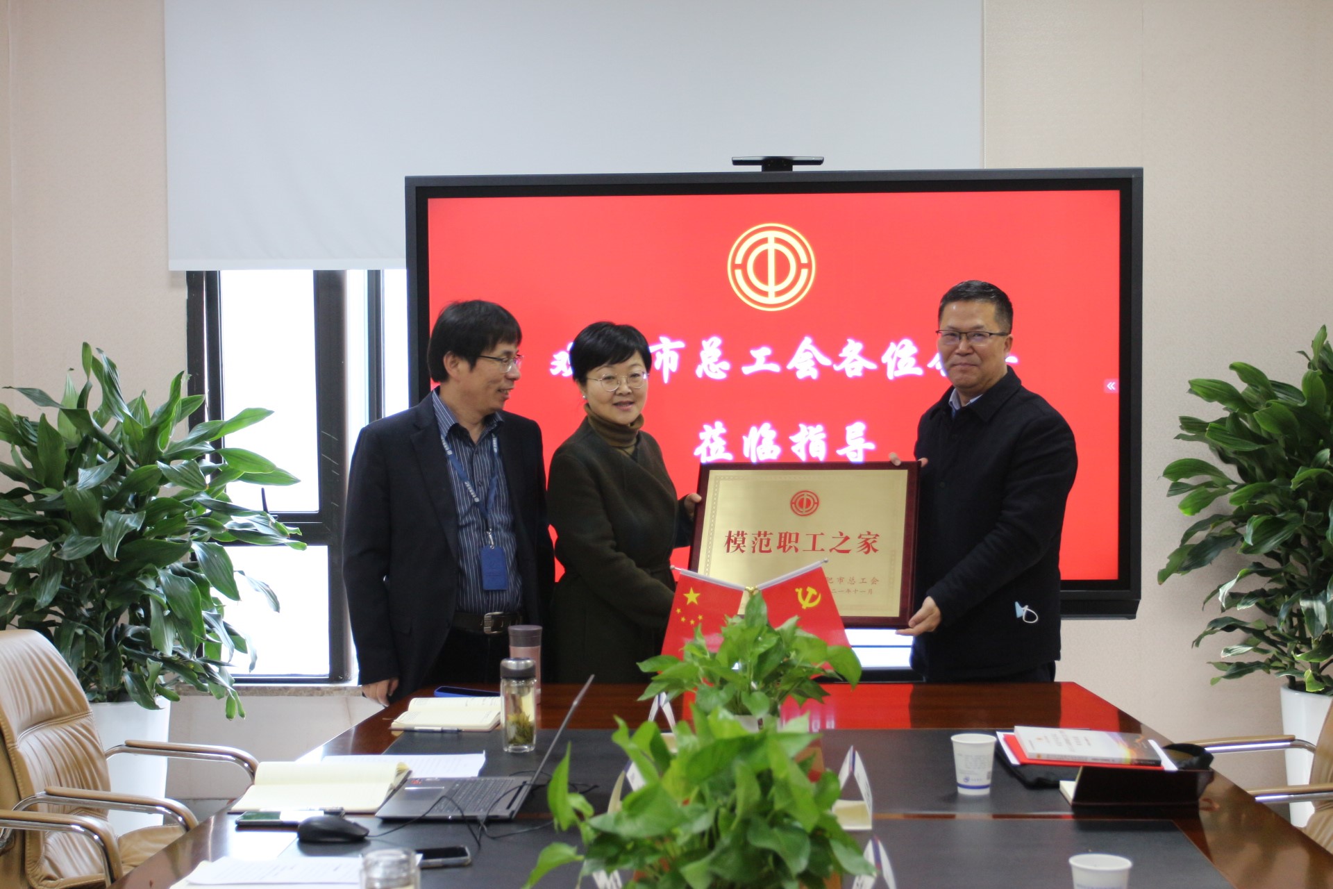 2022年1月18日上午國正公司舉行“合肥市模范職工之家”授牌儀式,合肥市總工會黨組成員、副主席梁建文、市財貿(mào)工會主席羅潔等一行蒞臨公司進(jìn)行授牌、頒獎,國正公司黨總支委員、董事、總經(jīng)理翟詠梅,黨總支委員、工會主席李云峰及工會委員參加儀式。