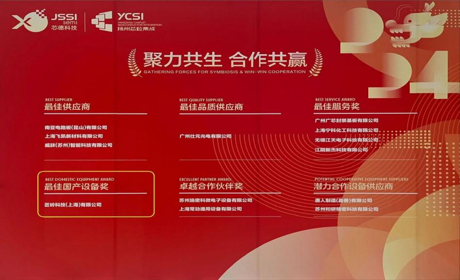 近日,我司已投企業(yè)匠嶺科技(上海)有限公司(以下簡稱“匠嶺科技”)榮獲由JSSI芯德半導體頒發(fā)的「最佳國產設備獎」。該獎是客戶對匠嶺科技的產品實力以及服務效能的高度認可。