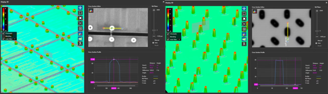 HIMA系列設備采用多維結構光檢測技術(MST技術),這項技術可有效抑制物體表面噪聲影響,實現(xiàn)高精度與高重復性的Bump Height和COP的3D量測。與此同時,這項技術可支持多通道圖像高速并行采集、并行處理和傳輸,并通過特有的3D融合算法進行形貌構建與分析,從而兼具了“高精度+高速度”的檢測性能。