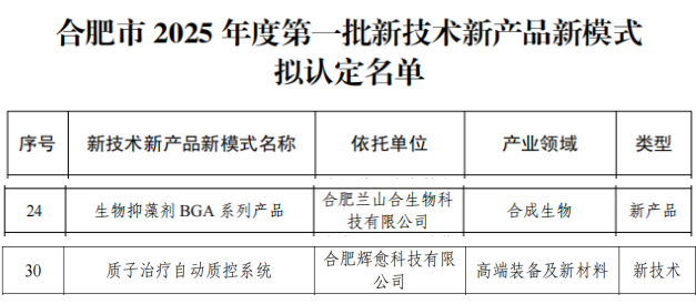 近日,合肥市科技局公示了合肥市2025年度第一批新技術(shù)新產(chǎn)品新模式(“三新”)名單,我司投資企業(yè)合肥蘭山合生物科技有限公司、合肥輝愈科技有限公司兩家企業(yè)入選。