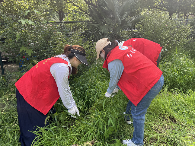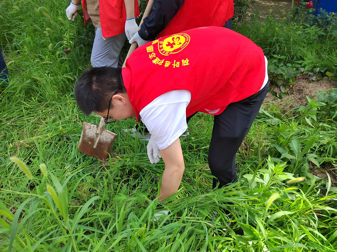 雖是清晨卻已烈日高懸,氣溫早早便飆升至高位,空氣里彌漫著灼人的熱氣,仿佛一切都被熱浪包圍。志愿者們頭戴草帽,手持鋤頭工具,迅速投入到除草工作中。社區(qū)草叢里,雜草叢生,蚊蟲環(huán)繞,半人高的雜草增添了清除的難度。然而,炎熱的氣溫和鋤草的難度并未擊退大家的熱情,汗水順著臉頰、脊背不斷滑落,浸濕了衣衫,卻澆不滅大家服務(wù)社區(qū)、服務(wù)人民群眾的初心。黨員們沖鋒在前,團(tuán)員們緊隨其后,大家齊心協(xié)力,有的負(fù)責(zé)鏟除高草,有的彎腰清理草根,有的將雜草聚攏搬運(yùn)。
